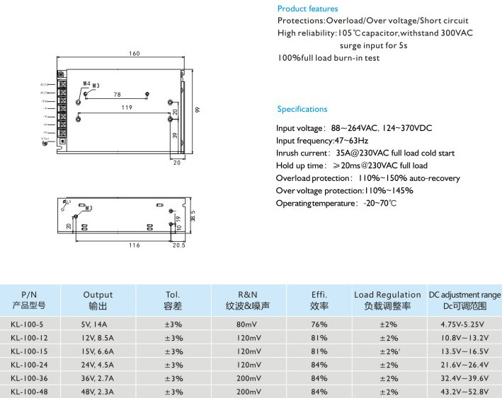 高可靠性:105C長(zhǎng)壽命電容,能承受300VAC輸入電壓5秒不損壞